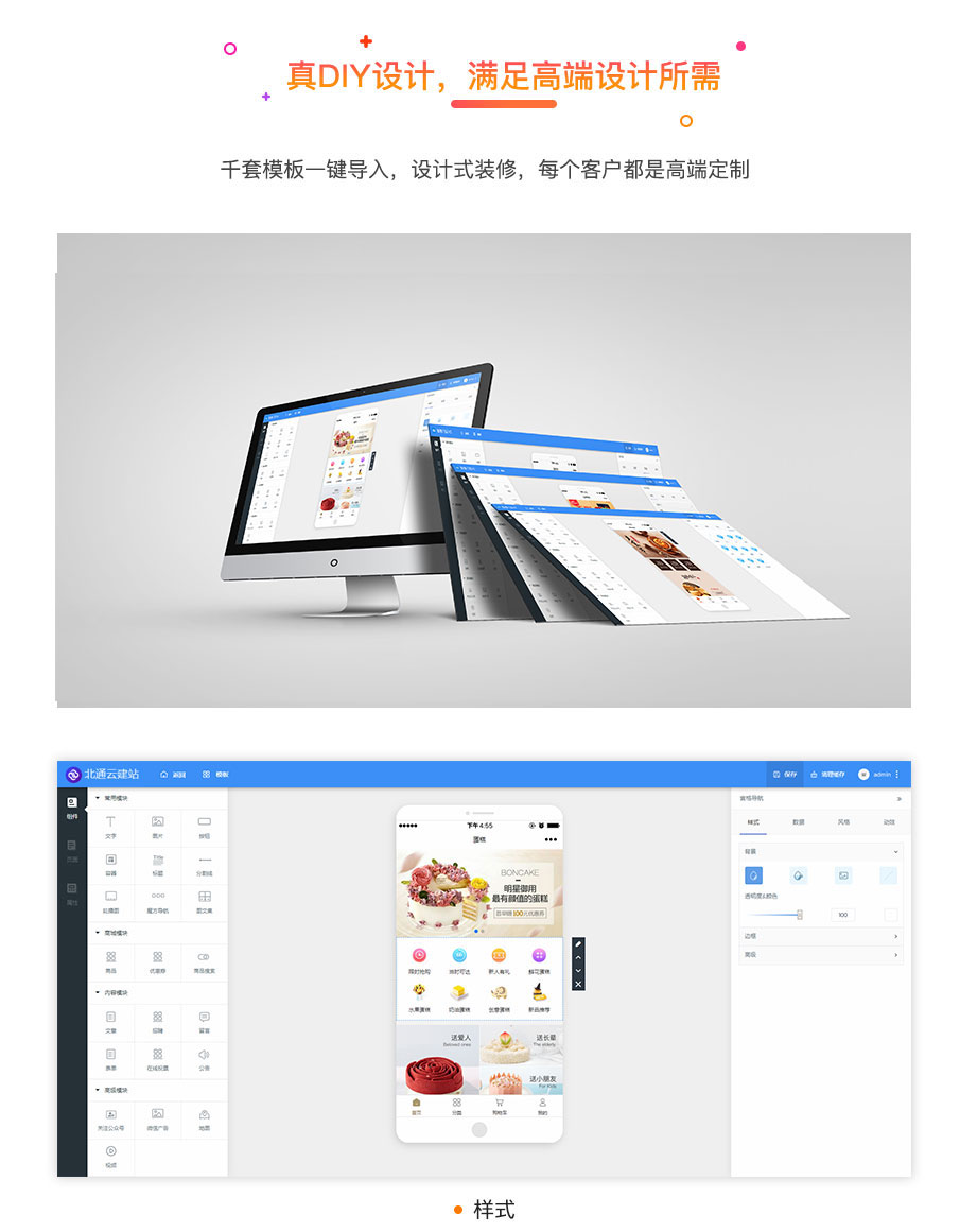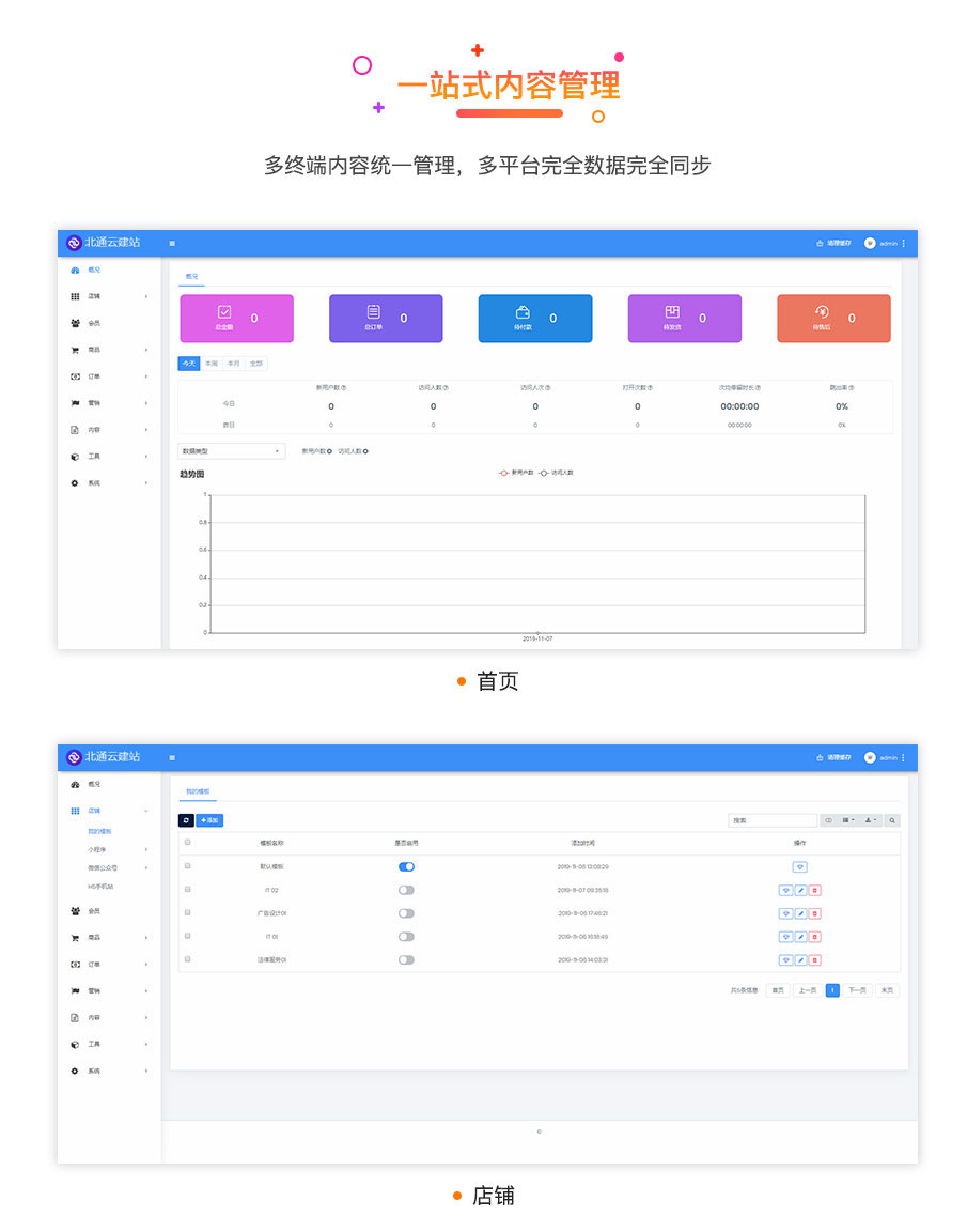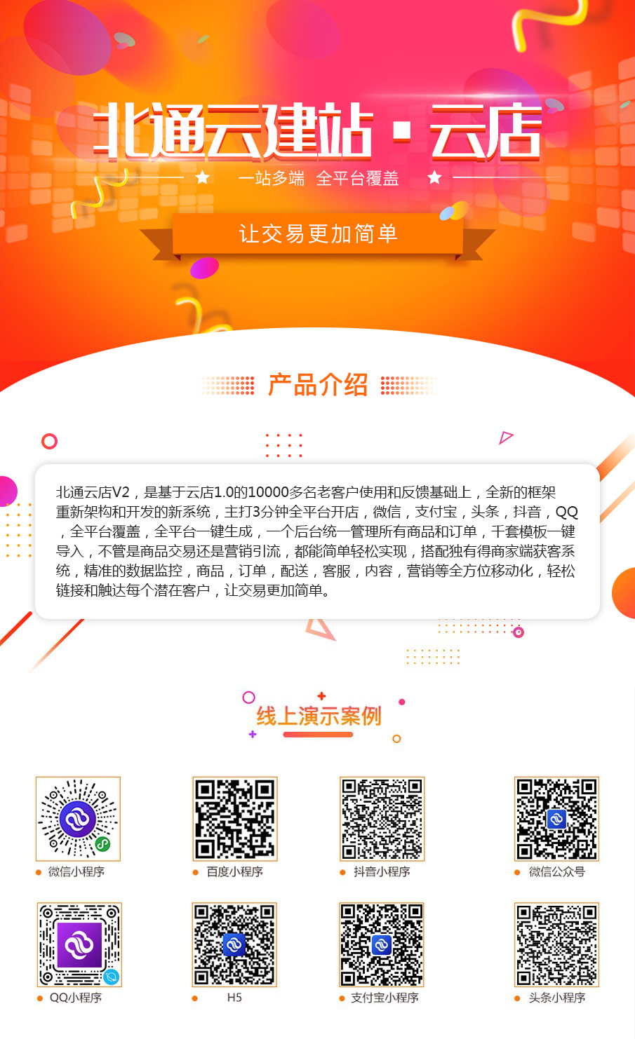 北通云建站·云店V2,是基于云店1.0的1000多名老客户使用和反馈基础上,全新的框架,重新架构和开发的新系统,主打3分钟全平台开店,微信,支付宝,头条,抖音,QQ全平台覆盖,全平台-键生成,一个后台统-管理所有商品和订单,千套模板一键导入,不管是商品交易还是营销引流,都能简单轻松实现,搭配独有得商家端获客系统,精准的数据监控,品,订单,配送,客服,内容,营销等全方位移动化,轻松链接和触达每个潜在客户,让交易更加简单。